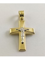 Ανδρικός Σταυρός δημιουργίας "Μενέκου", σε κίτρινο χρυσό 14 καρατίων, minimal  γραμμής με  ανάγλυφο σχέδιο και ένθετο λευκόχρυσο εσταυρωμένο. Γυαλιστερή, σατινέ ματ υφή.