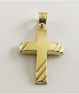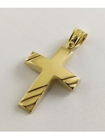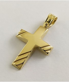 Ανδρικός Σταυρός δημιουργίας "Μενέκου", σε κίτρινο χρυσό 14 καρατίων, minimal γραμμής με ανάγλυφο σχέδιο στις δύο οριζόντιες άκρες του καθώς και στο κάτω κάθετο άκρο του. Γυαλιστερή, σατινέ ματ υφή.