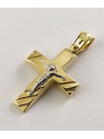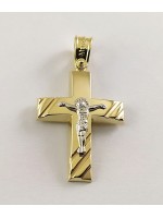 Ανδρικός Σταυρός δημιουργίας "Μενέκου", σε κίτρινο χρυσό 14 καρατίων, minimal γραμμής με ανάγλυφο σχέδιο στις δύο οριζόντιες άκρες του καθώς και στο κάτω κάθετο άκρο του και ένθετο λευκόχρυσο εσταυρωμένο. Γυαλιστερή, σατινέ ματ υφή.