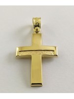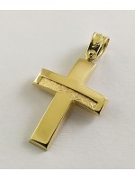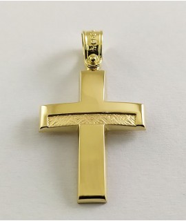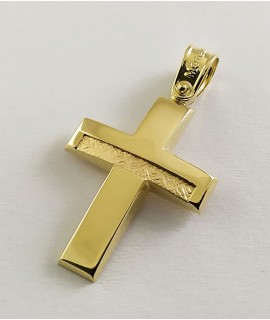 Ανδρικός Σταυρός δημιουργίας "Μενέκου", σε κίτρινο χρυσό 14 καρατίων, minimal , καμπύλης γραμμής  με ανάγλυφο σατινέ σχέδιο στο κάτω και πάνω κάθετο τμήμα του. Γυαλιστερή σατινέ ματ υφή.