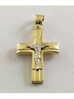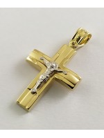 Ανδρικός Σταυρός δημιουργίας "Μενέκου", σε κίτρινο χρυσό 14 καρατίων, minimal  γραμμής με ανάγλυφο σχέδιο σταυρού στο κέντρο και ένθετο λευκόχρυσο σταυρό. Γυαλιστερή σατινέ ματ υφή.