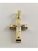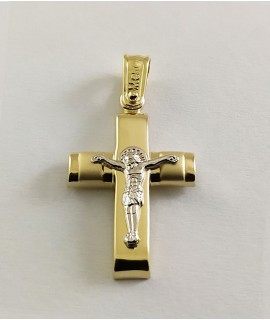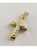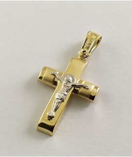 Ανδρικός Σταυρός δημιουργίας "Μενέκου", σε κίτρινο χρυσό 14 καρατίων, minimal γραμμής με ανάγλυφο σατινέ σχέδιο στο αριστερό και δεξιό οριζόντιο τμήμα του και ένθετο λευκόχρυσο εσταυρωμένο. Γυαλιστερή, σατινέ ματ υφή.