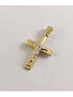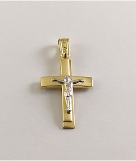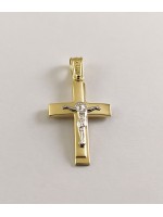 Ανδρικός Σταυρός δημιουργίας "Μενέκου", σε κίτρινο χρυσό 14 καρατίων, minimal γραμμής, με ανάγλυφο σχέδιο και ένθετο λευκόχρυσο εσταυρωμένο. Γυαλιστερή, σατινέ ματ υφή.
