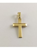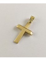 Ανδρικός Σταυρός δημιουργίας "Μενέκου", σε κίτρινο χρυσό 14 καρατίων, minimal γραμμής με σατινέ υφή και ανάγλυφο σχέδιο στο οριζόντιο τμήμα του.