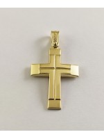 Ανδρικός Σταυρός δημιουργίας "Μενέκου", σε κίτρινο χρυσό 14 καρατίων, minimal γραμμής με ανάγλυφο σαγρέ σχέδιο σταυρού και γυαλιστερές άκρες.