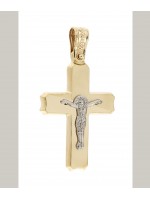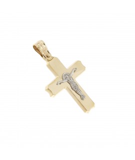 Ανδρικός Σταυρός δημιουργίας "Μενέκου", σε κίτρινο χρυσό 14 καρατίων σε γυαλιστερή και ζαγρε υφή και με ένθετο λευκόχρυσο εσταυρωμένο. Γυαλιστερή σατινέ ματ υφή.