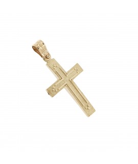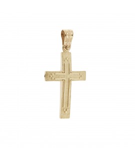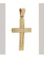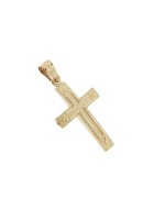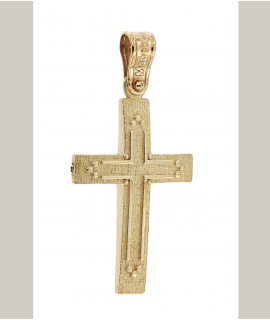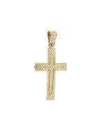 Ανδρικός Σταυρός δημιουργίας "Μενέκου", σε κίτρινο χρυσό 14 καρατίων γυαλιστερής υφής με ανάγλυφο σχέδιο. Γυαλιστερή σατινέ ματ υφή.
