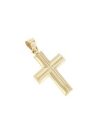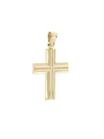 Ανδρικός Σταυρός δημιουργίας "Μενέκου", σε κίτρινο χρυσό 14 καρατίων γυαλιστερής υφής και ανάγλυφο σχέδιο σταυρού. Γυαλιστερή σατινέ ματ υφή.