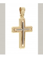 Δίχρωμος Ανδρικός Σταυρός δημιουργίας "Μενέκου", σε κίτρινο χρυσό 14 καρατίων με ανάγλυφο σχέδιο, το οποίο δημιουργεί σταυρό γυαλιστερής υφής με ματ λευκόχρυσο σταυρό. Γυαλιστερή σατινέ ματ υφή.