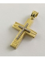Γυναικείος Σταυρός δημιουργίας "Μενέκου", σε κίτρινο χρυσό 14 καρατίων, minimal γραμμής με ανάγλυφο μοτίβο ζέβρας σε όλο το μήκος του οριζοντίου τμήματός του, στο κάτω κάθετο τμήμα του και ένθετο σταυρό από πέτρες ζιργκόν. Γυαλιστερή σατινέ ματ υφή.