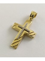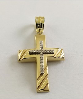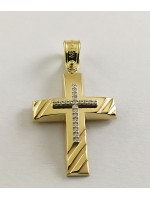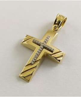 Γυναικείος Σταυρός δημιουργίας "Μενέκου", σε κίτρινο χρυσό 14 καρατίων, minimal γραμμής με ανάγλυφο σχέδιο στις δύο οριζόντιες άκρες του καθώς και στο κάτω κάθετο άκρο του και ένθετο σταυρό από πέτρες ζιργκόν . Γυαλιστερή, σατινέ ματ υφή.