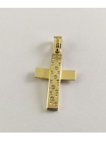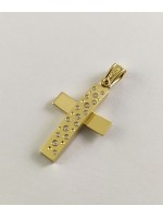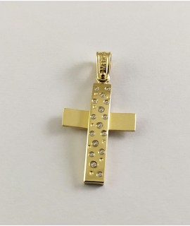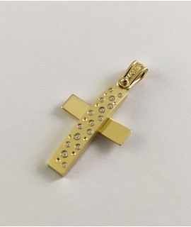 Γυναικείος  Σταυρός δημιουργίας "Μενέκου", σε κίτρινο χρυσό 14 καρατίων, με καμπύλες γραμμές και  πέτρες ζιργκόν στο οριζόντιο τμήμα του. Γυαλιστερή, σατινέ ματ υφή.