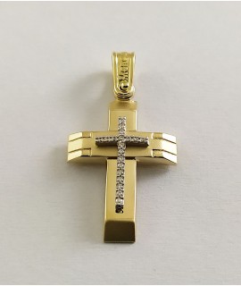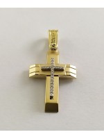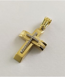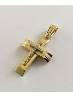 Γυναικείος Σταυρός δημιουργίας "Μενέκου", σε κίτρινο χρυσό 14 καρατίων, minimal γραμμής, με ανάγλυφο σχέδιο και στις δύο άκρες του οριζόντιου τμήματος του και  ένθετο σταυρό από πέτρες ζιργκόν. Σατινέ ματ υφή.
