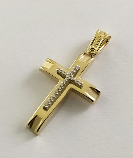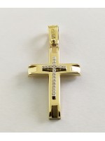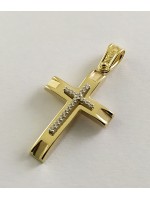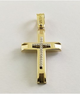 Γυναικείος Σταυρός δημιουργίας "Μενέκου", σε κίτρινο χρυσό 14 καρατίων, minimal γραμμής με ένθετο σταυρό από πέτρες ζιργκόν. Γυαλιστερή, σατινέ ματ υφή.