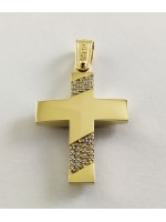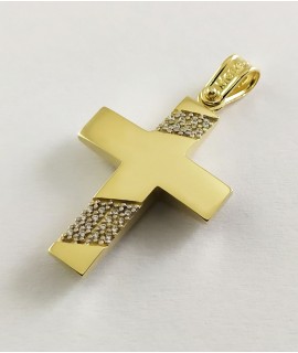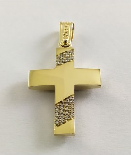 Γυναικείος Σταυρός δημιουργίας "Μενέκου", σε κίτρινο χρυσό 14 καρατίων. Η κύρια όψη του σχηματίζεται από καμπύλες γραμμές, ενώ 2 σειρές από πέτρες ζιργκόν στολίζουν το πάνω μέρος και 4 σειρές από πέτρες ζιργκόν το κάτω μέρος του κάθετου τμήματός του. Γυαλιστερή σατινέ ματ υφή.