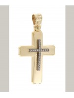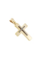Γυναικείος Σταυρός δημιουργίας "Μενέκου", σε κίτρινο χρυσό 14 καρατίων, σε σατινέ υφή και ένθετο σταυρό από πέτρες ζιργκόν. Γυαλιστερή σατινέ ματ υφή.