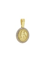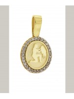 Ζώδιο κρεμαστό , δημιουργίας "Μενέκου" σε κίτρινο χρυσό, με ανάγλυφη επιφάνεια σε οβάλ σχήμα πλαισιωμένο με πέτρες ζιργκόν. Γυαλιστερή, σατινέ, ματ υφή.