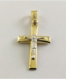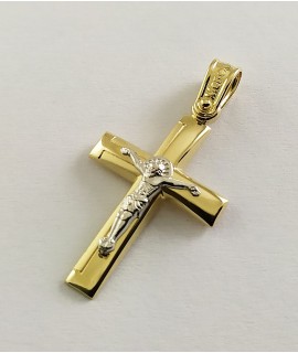 Ανδρικός Σταυρός δημιουργίας "Μενέκου", σε κίτρινο χρυσό 14 καρατίων, minimal γραμμής με λευκόχρυσο εσταυρωμένο. Γυαλιστερή, σατινέ ματ υφή, οι οποίες δημιουργούν σταυρό εσωτερικά.