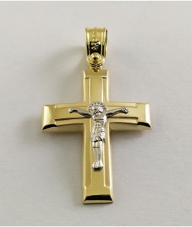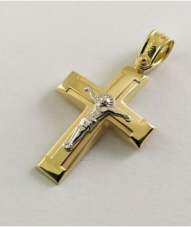 Ανδρικός Σταυρός δημιουργίας "Μενέκου", σε κίτρινο χρυσό 14 καρατίων, minimal γραμμής με ανάγλυφο σχέδιο σταυρού στο κέντρο και ένθετο λευκόχρυσο εσταυρωμένο. Γυαλιστερή σατινέ ματ υφή.