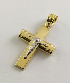 Ανδρικός Σταυρός δημιουργίας "Μενέκου", σε κίτρινο χρυσό 14 καρατίων, minimal γραμμής με ανάγλυφο σχέδιο στις δύο οριζόντιες άκρες του και ένθετο λευκόχρυσο εσταυρωμένο.