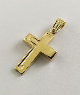 Ανδρικός Σταυρός δημιουργίας "Μενέκου", σε κίτρινο χρυσό 14 καρατίων, minimal γραμμής με ανάγλυφο σχέδιο σταυρού. Γυαλιστερή, σατινέ ματ υφή.