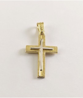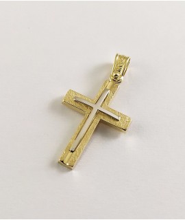 Ανδρικός Σταυρός δημιουργίας "Μενέκου", σε κίτρινο χρυσό 14 καρατίων, minimal γραμμής, σαγρέ με ανάγλυφο σατινέ ματ, σχέδιο στο κάθετο τμήμα του και ένθετο λευκόχρυσο σταυρό.