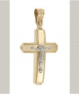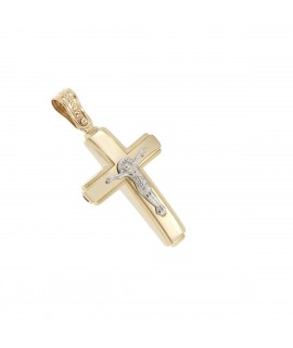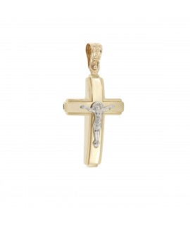 Ανδρικός Σταυρός δημιουργίας "Μενέκου", σε κίτρινο χρυσό 14 καρατίων, minimal γραμμής με ανάγλυφο σχέδιο και ένθετο λευκόχρυσο εσταυρωμένο. Γυαλιστερή σατινέ ματ υφή.