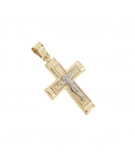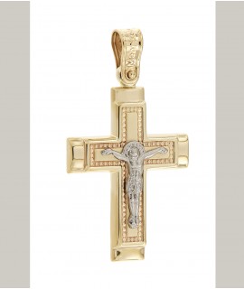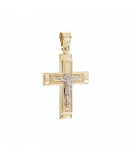 Ανδρικός Σταυρός δημιουργίας "Μενέκου", σε κίτρινο χρυσό 14 καρατίων, ανάγλυφο σχέδιο γυαλιστερού χρυσού σταυρού με ένθετο λευκόχρυσο εσταυρωμένο. Γυαλιστερή σατινέ ματ υφή.