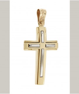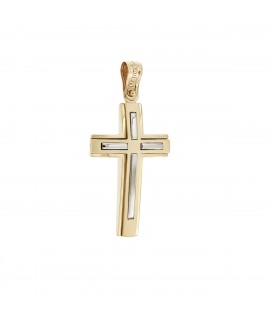 Δίχρωμος Ανδρικός Σταυρός δημιουργίας "Μενέκου", σε κίτρινο χρυσό 14 καρατίων ο οποίος εμπεριέχει σταυρό σε σατινε χρυσό, οποίος εμπεριέχει σταυρό από σατινέ λευκόχρυσο. Γυαλιστερή σατινέ ματ υφή.