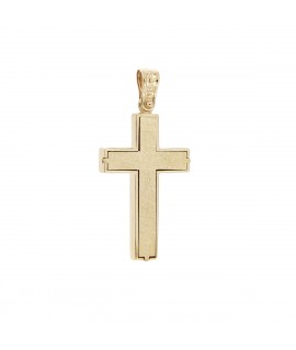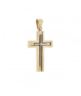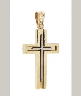 Δίχρωμος Ανδρικός Σταυρός δημιουργίας "Μενέκου", σε κίτρινο χρυσό 14 καρατίων ο οποίος περιέχει ανάγλυφο σταυρό σε ζαγρέ κίτρινο χρυσό και σταυρό από λευκόχρυσο σατινέ υφής. Γυαλιστερή σατινέ ματ υφή.