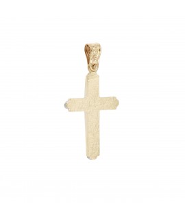 Δίχρωμος Ανδρικός Σταυρός δημιουργίας "Μενέκου", σε κίτρινο χρυσό 14 καρατίων γυαλιστερής υφής, με ανάγλυφο σχέδιο, ο οποίος εμπεριέχει σταυρό από ματ λευκόχρυσο. Γυαλιστερή σατινέ ματ υφή.