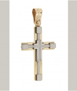 Ανδρικός Σταυρός δημιουργίας "Μενέκου", σε κίτρινο χρυσό 14 καρατίων γυαλιστερής υφής με ένθετο σταυρό από λευκόχρυσο σε σατινέ, ματ, γυαλιστερή υφή. Γυαλιστερή σατινέ ματ υφή.