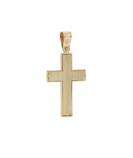 Δίχρωμος Ανδρικός Σταυρός δημιουργίας "Μενέκου", σε κίτρινο χρυσό 14 καρατίων γυαλιστερής υφής και ανάγλυφο σχέδιο σταυρού και σταυρό από λευκόχρυσο. Γυαλιστερή σατινέ ματ υφή.