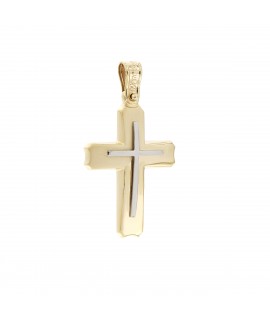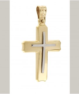 Δίχρωμος Ανδρικός Σταυρός δημιουργίας "Μενέκου", σε κίτρινο χρυσό 14 καρατίων με σχέδιο σε σατινέ και γυαλιστερή υφή, ο οποίος εμπεριέχει σταυρό από γυαλιστερό λευκόχρυσο. Γυαλιστερή σατινέ ματ υφή.