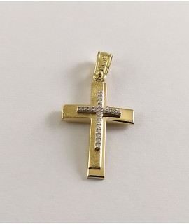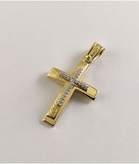 Γυναικείος Σταυρός δημιουργίας "Μενέκου", σε κίτρινο χρυσό 14 καρατίων, minimal γραμμής, με σαγρέ ανάγλυφο σχέδιο και ένθετο σταυρό από πέτρες ζιργκόν.