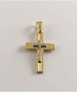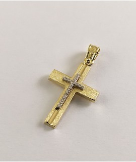 Γυναικείος Σταυρός δημιουργίας "Μενέκου", σε κίτρινο χρυσό 14 καρατίων, minimal γραμμής, σαγρέ με ανάγλυφο σατινέ ματ, σχέδιο στο κάθετο τμήμα του και ένθετο σταυρό από πέτρες ζιργκόν.