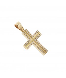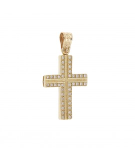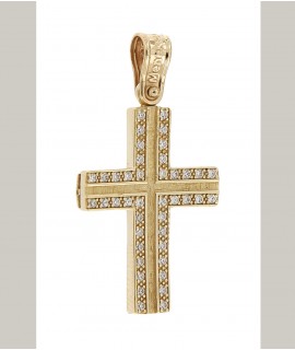 Γυναικείος Σταυρός δημιουργίας "Μενέκου", σε κίτρινο χρυσό 14 καρατίων, με ανάγλυφο σταυρό από γυαλιστερό χρυσό. Το εσωτερικό του σταυρού κατά μήκος του διακοσμούν πέτρες ζιργκόν. Γυαλιστερή σατινέ ματ υφή.