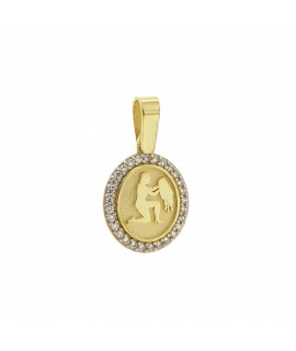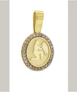 Ζώδιο κρεμαστό , δημιουργίας "Μενέκου" σε κίτρινο χρυσό, με ανάγλυφη επιφάνεια σε οβάλ σχήμα πλαισιωμένο με πέτρες ζιργκόν. Γυαλιστερή, σατινέ, ματ υφή.