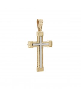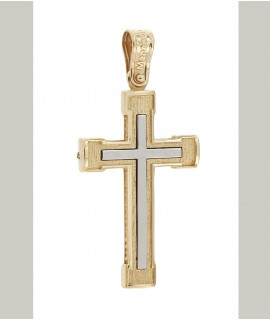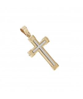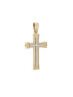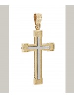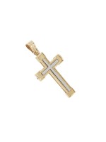 Men's Greek Orthodox cross "Menekou" 14k, yellow gold glossy texture with a relief design and a white-gold cross, satine texture. Glossy, satine, matte texture.